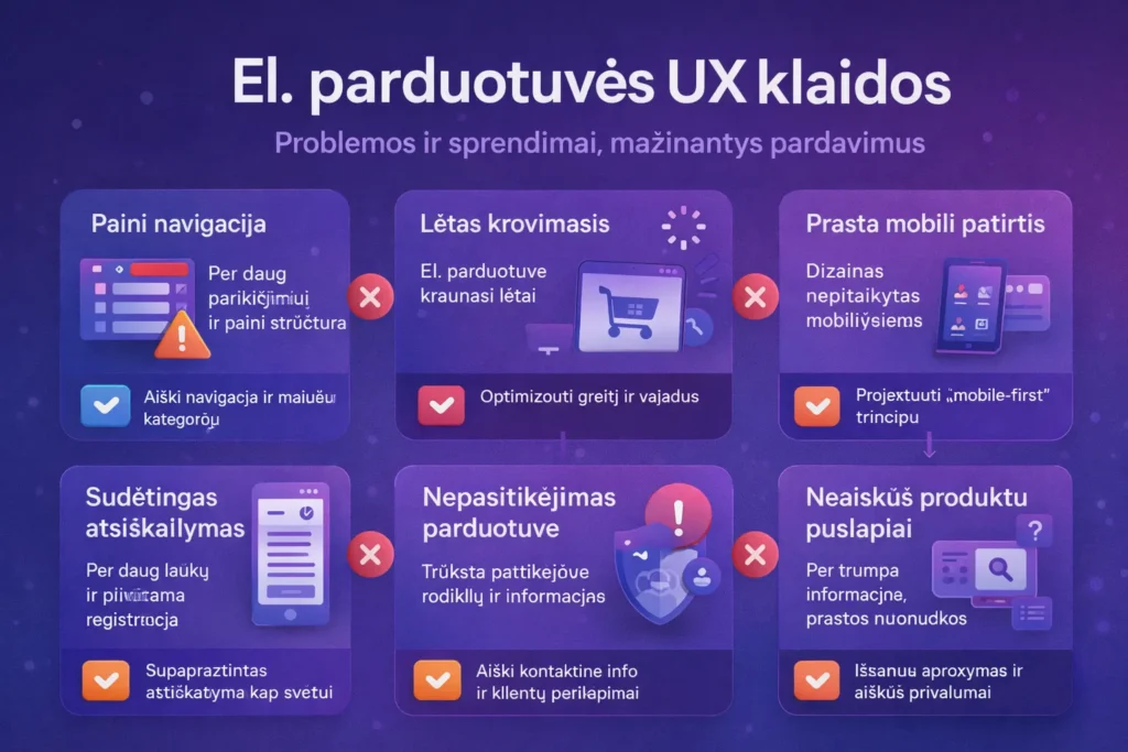 Šiame straipsnyje aptarsime dažniausias UX klaidas, kurios kainuoja pardavimus, ir pateiksime praktinius sprendimus, padedančius padidinti konversijas bei klientų pasitenkinimą.
